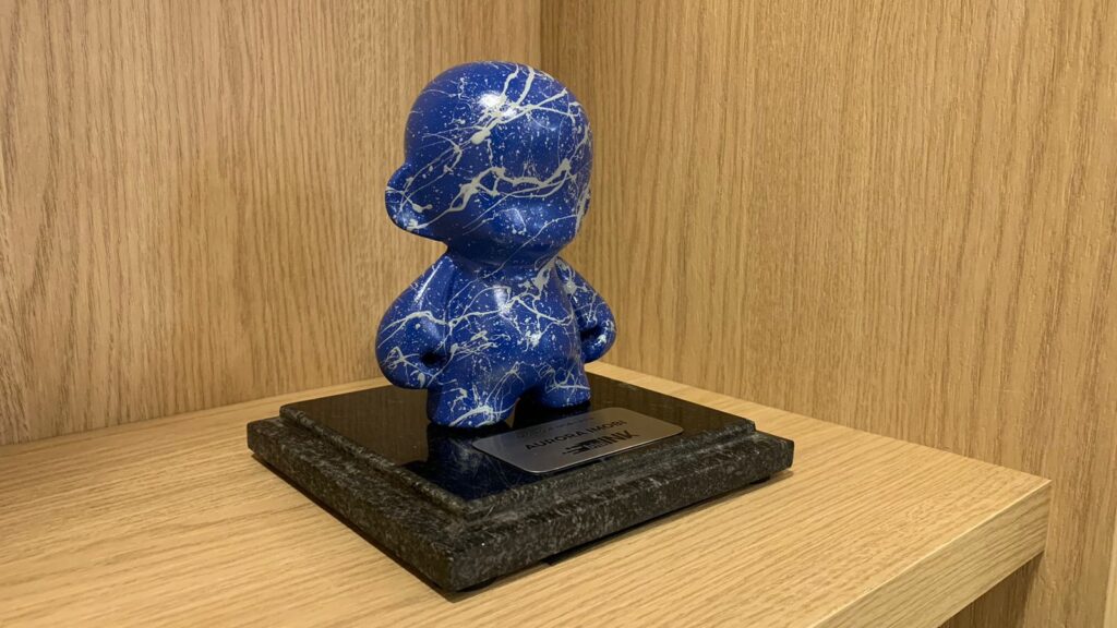 Como prêmio, recebemos também um mimo: o blu (Mini Manny), mascote do blu.INK, que agora está bem instalado em nossa sala de troféus. E nossa equipe amou o presente!